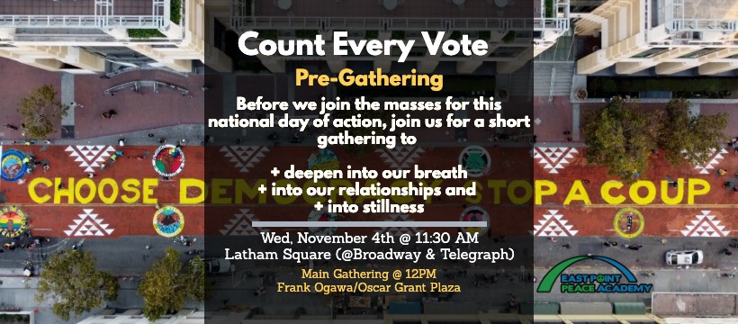 On November 4th, the day after the election, Protect the Results is calling for a national day of action to demand that every vote be counted. Locally in the East Bay, Bay Resistance is organizing an Oakland gathering at 12PM at Frank Ogawa/Oscar Grant Plaza and calling everyone to join us regardless of the results.