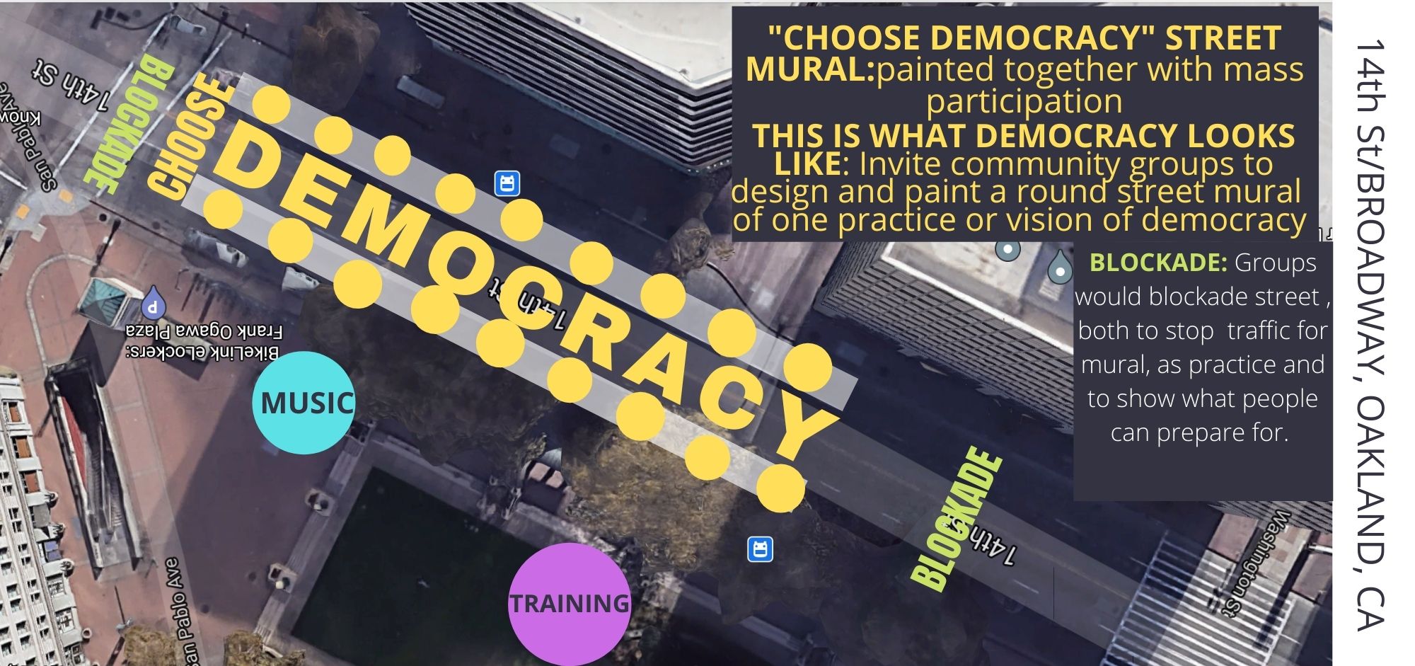 - STREET MURALING: This is What Democracy Looks Like Street Murals: a number community groups will paint street murals they have designed showing examples and visions of democracy in our communities and we will do one giant DEMOCRACY street mural open to participants. Painting street murals is a participatory, creative way to assert ourselves in public space and is a Bay Area tradition over the last decade by movements for Indigenous sovereignty, climate justice, economic justice and Black Lives Matter.