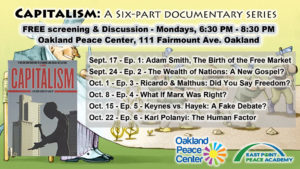 Capitalism: A Six Part Documentary Episode Six: Karl Polanyi, The Human Factor Monday, October 22nd 6:30 PM -8:30 PM Shelton Hall, Oakland Peace Center 111 Fairmount Ave, Oakland, CA Free, no RSVP needed. Please bring snacks to share if you are able. 6:30PM - Introduction 6:40 PM - Film Screening (each episode is about 50 minutes long) 7:40 PM - Discussion 8:30 PM - Closing The economic system of capitalism has undermined democracies throughout the world, created huge income disparities,…