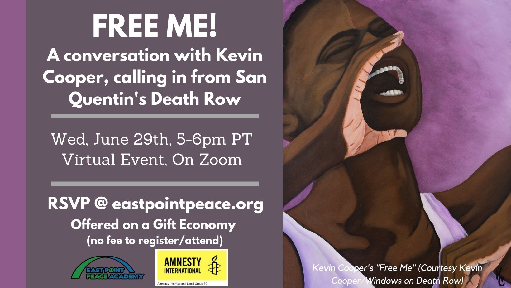 East Point Peace Academy and San Francisco's Amnesty International Local Group 30 are proud to co-host this very special event, featuring Kevin Cooper calling in from San Quentin's death row to discuss his continuing struggle for freedom and for the abolition of the death penalty. Please join us!!