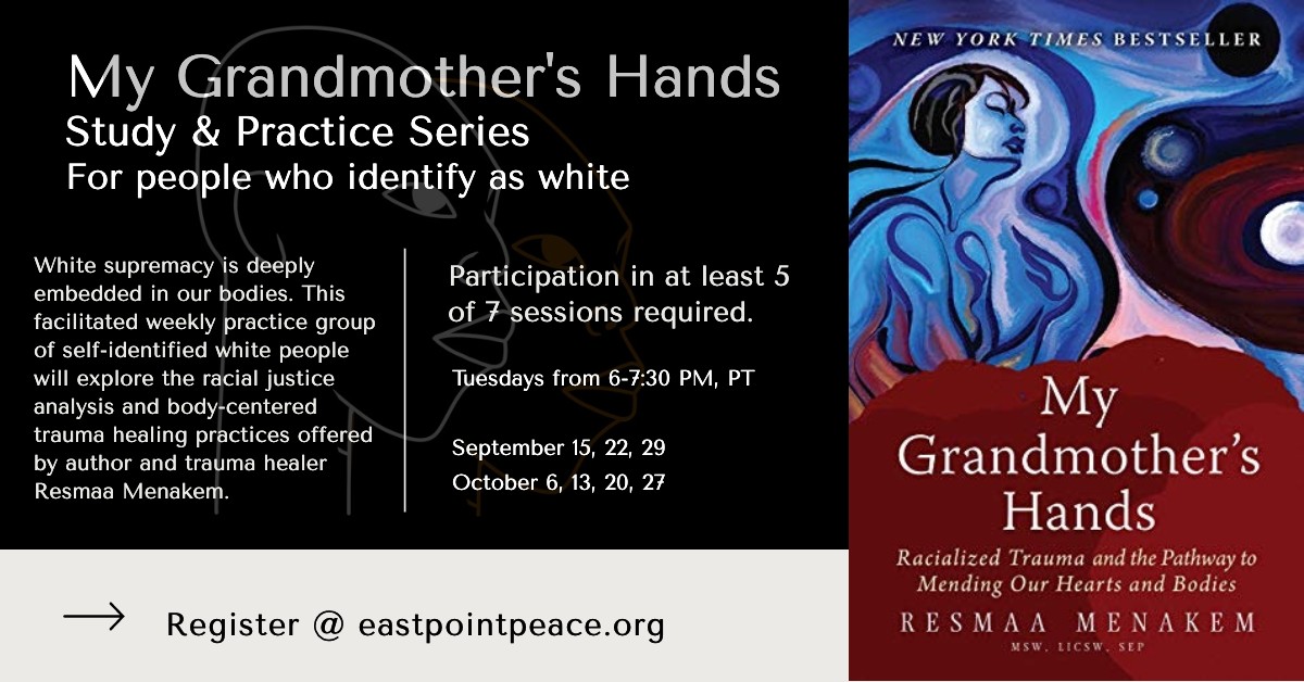 WE ARE SORRY, BUT THE MY GRANDMOTHER'S HANDS READING AND PRACTICE GROUP HAS ALREADY STARTED, AND WE ARE THEREFORE NO LONGER ACCEPTING REGISTRATIONS. PLEASE SIGN UP FOR OUR MAILING LIST IF YOU WOULD LIKE UPDATES ON FUTURE GROUPS, OR FOR WAYS TO STAY INVOLVED WITH ORGANIZING EFFORTS FOR NOVEMBER.