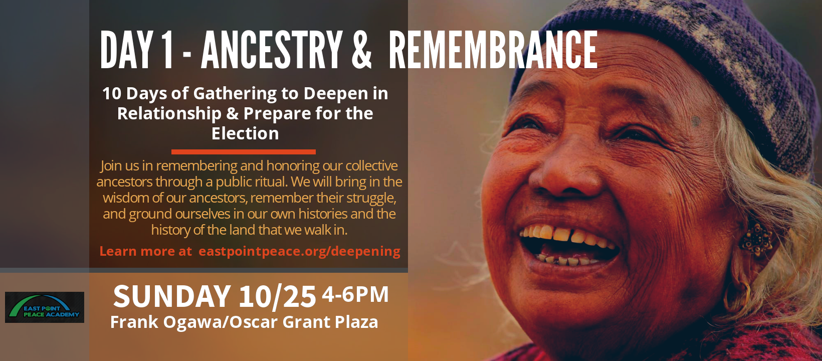 Starting on Sunday, October 25th, we will gather each day from 4PM - 6PM (unless otherwise noted) at Frank Ogawa/Oscar Grant Plaza in front of Oakland City Hall.